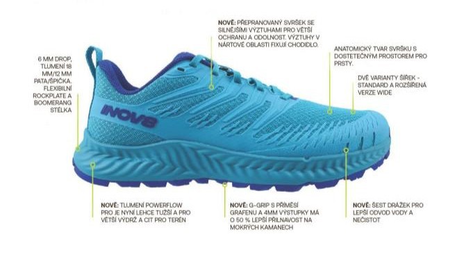 Vylepšená podešev G-GRIP s grafenem nabízí až o 50 % lepší trakci na různých površích. Na špičce navíc nově najdete šest drážek pro lepší odvod vody a nečistot. Tlumení POWERFLOW PRO (u TRAILFLY V2) je pocitově tužší než u předchozí verze, přesto neztrácí své tlumicí schopnosti. Naopak nabízí lepší cit pro terén a umožňuje dynamičtější pohyb.